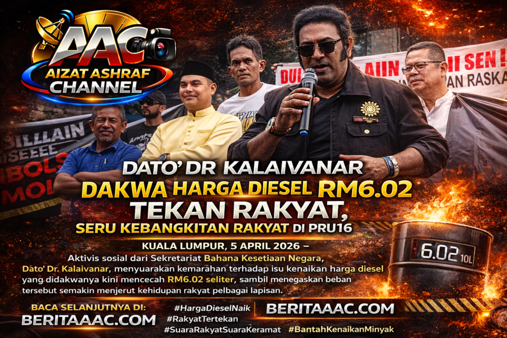 KUALA LUMPUR, 5 April 2026 – Aktivis sosial dari Sekretariat Bahana Kesetiaan Negara, Dato’ Dr. Kalaivanar, menyuarakan kemarahan terhadap isu kenaikan harga diesel yang didakwanya kini mencecah RM6.02 seliter, sambil menegaskan beban tersebut semakin menjerut kehidupan rakyat pelbagai lapisan.