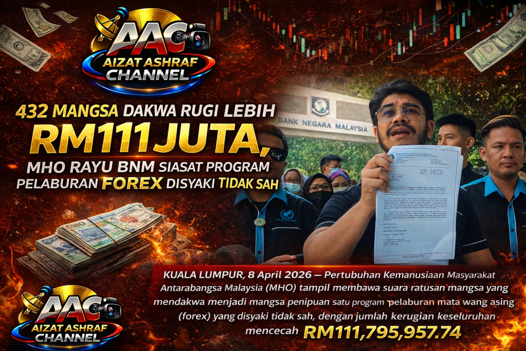 KUALA LUMPUR, 8 April 2026 – Pertubuhan Kemanusiaan Masyarakat Antarabangsa Malaysia (MHO) tampil membawa suara ratusan mangsa yang mendakwa menjadi mangsa penipuan satu program pelaburan mata wang asing (forex) yang disyaki tidak sah, dengan jumlah kerugian keseluruhan dianggarkan mencecah RM111,795,957.74.